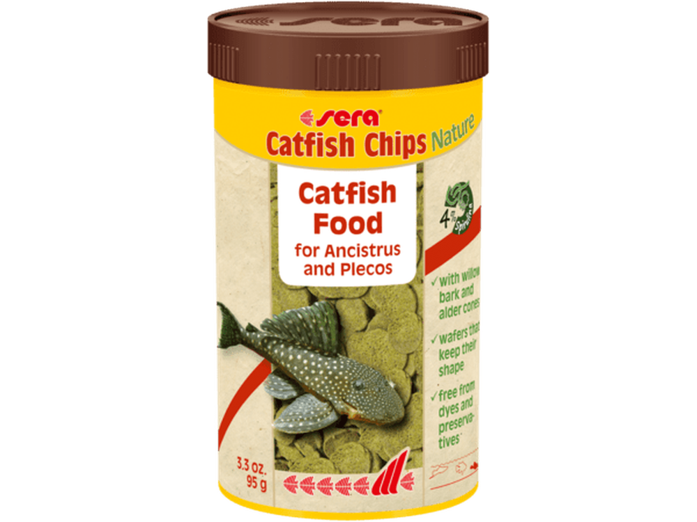 Sera Catfish Chips Nature 3.3oz is a premium staple food specially crafted for bottom-dwelling, rasping fish like Ancistrus and plecos, free from artificial colors and preservatives.