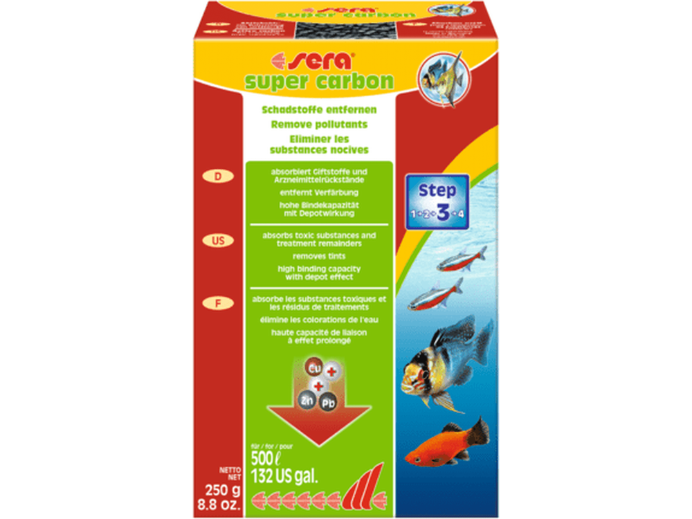 Additionally, Sera Super Carbon is ideal for emergency use in cases of sudden toxicity (such as contamination from renovation materials, inappropriate decor, or accidental overdoses) and for clearing unwanted water colorations.