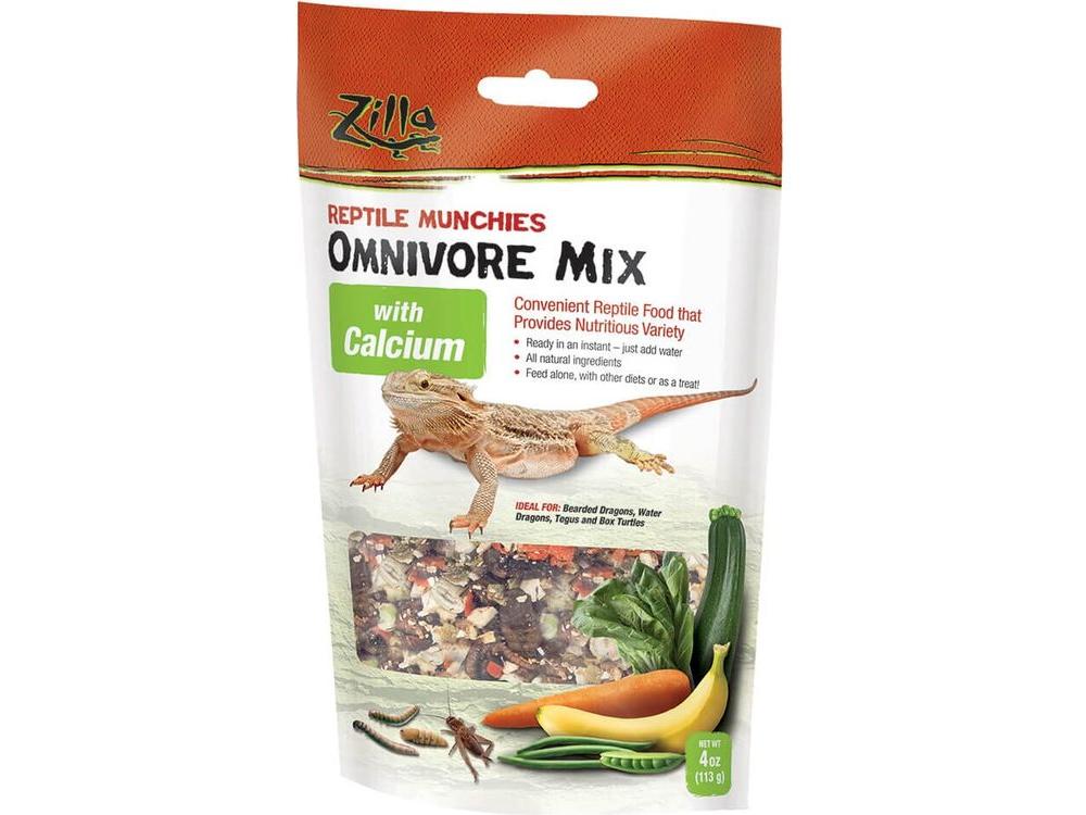 Zilla Reptile Munchies Omnivore with Calcium offers a wholesome blend of freeze-dried insects, veggies, and fruits, making it an excellent supplement for your omnivorous reptile's diet. This dehydrated food requires no refrigeration, providing a hassle-free treat or salad enhancer. Enriched with calcium, it supports your reptile's bone health and overall nutrition. Ideal for species like bearded dragons, blue tongue skinks, box turtles, Chinese water dragons, and tegus, this product from ReptileSupply.com is a convenient choice. To prepare, mix 1 part warm water with 2 parts Zilla Reptile Munchies, let it rehydrate for about 5 minutes, drain excess liquid, and serve in a shallow dish. It can also be fed dry or used as a topping, ensuring fresh water is available. Remember, this is a supplementary food to complement a balanced diet. Key nutritional content includes a minimum of 17% crude protein, 6% crude fat, and 2% calcium, with a maximum of 6% crude fiber and 10% moisture. Ingredients feature sun-cured bok choy, dehydrated zucchini, green beans, peas, bananas, carrots, crickets, mealworms, silkworm pupae, and calcium additives.