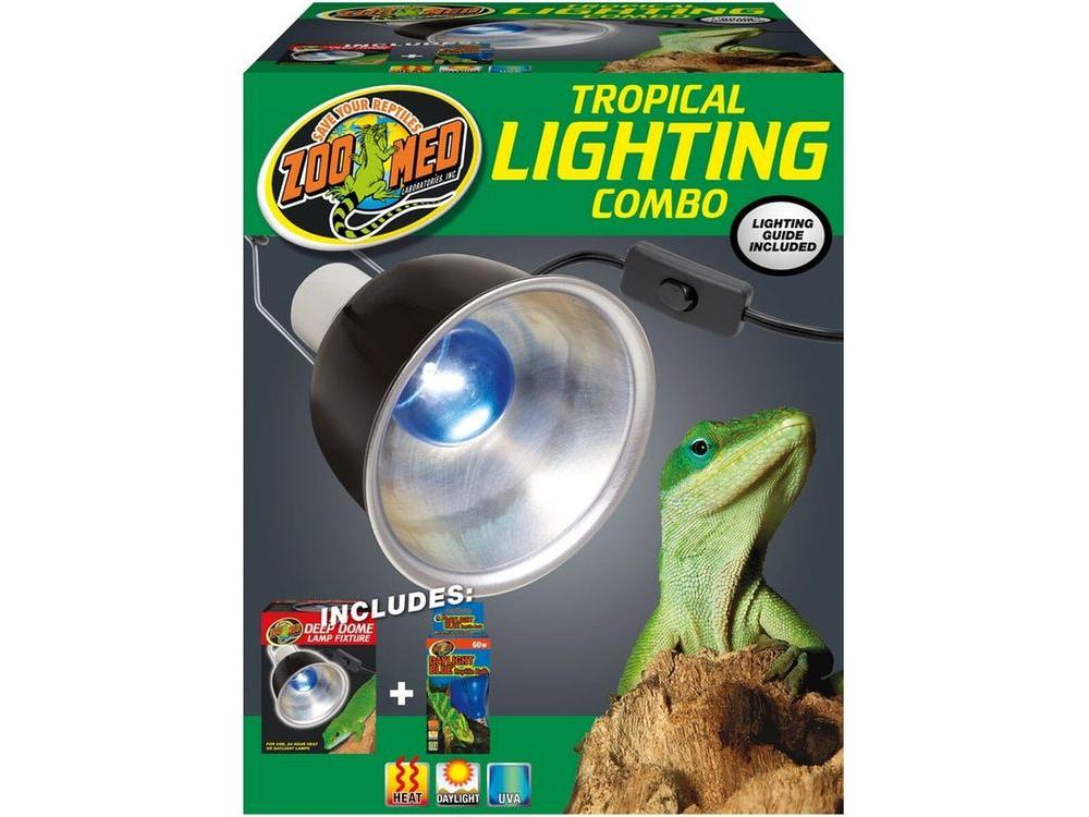 The Zoo Med Tropical Lighting Combo Pack comes with a Mini Deep Dome Lamp Fixture and a 60w Daylight Blue Reptile Bulb for your terrarium setup.